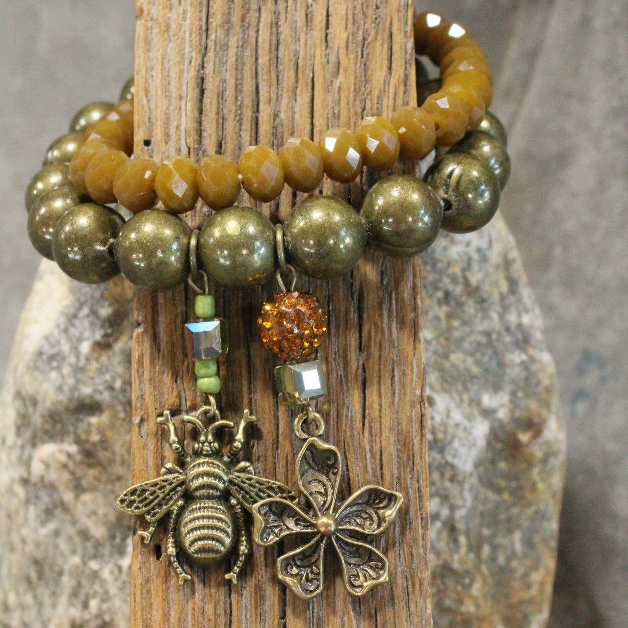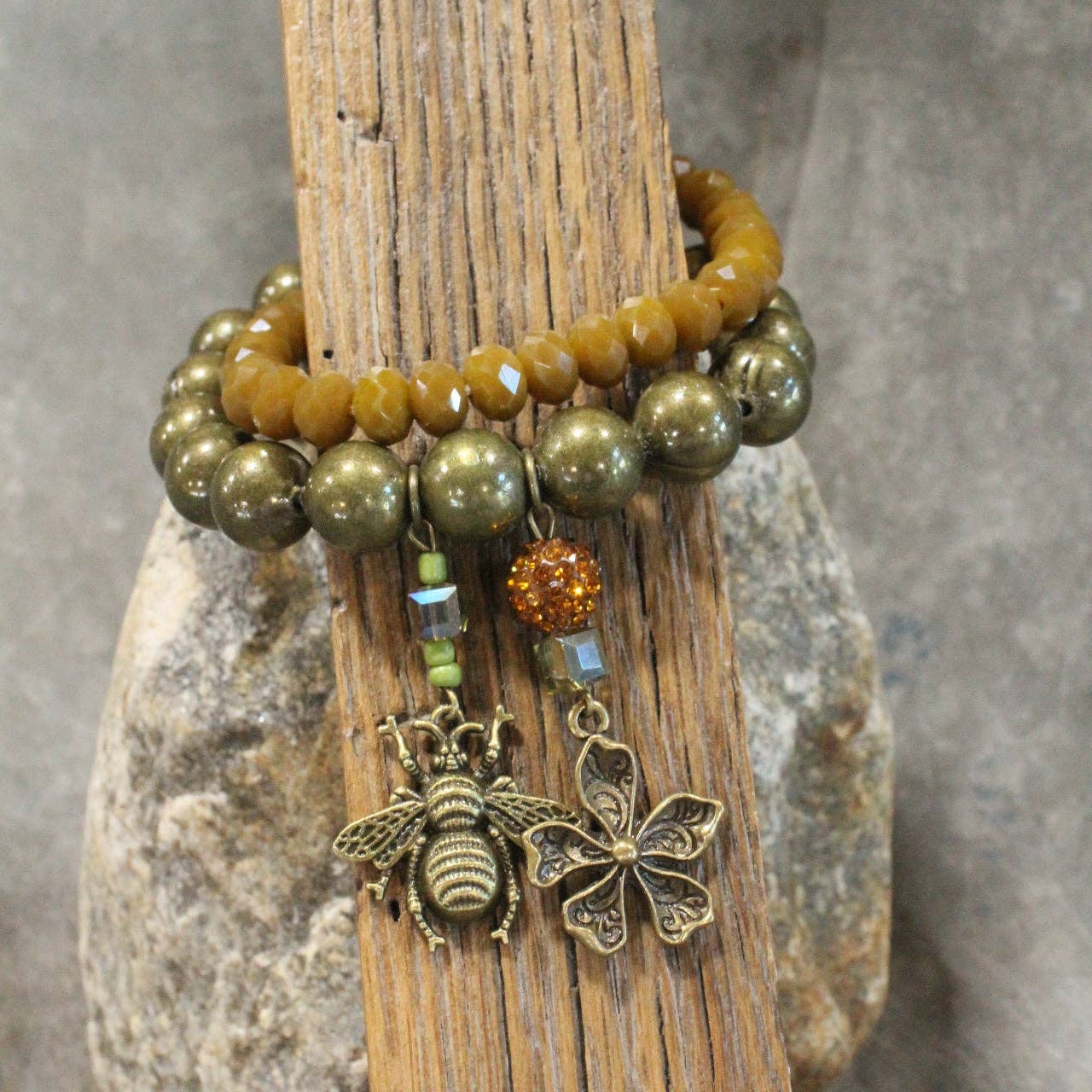 Our designs are created with vintage Czech beads, textured Picasso beads, crystals, natural stones; which includes: amazonite, quartz, fossil, jasper, jade, howlite, hematite, lazuli, turquoise, & more.