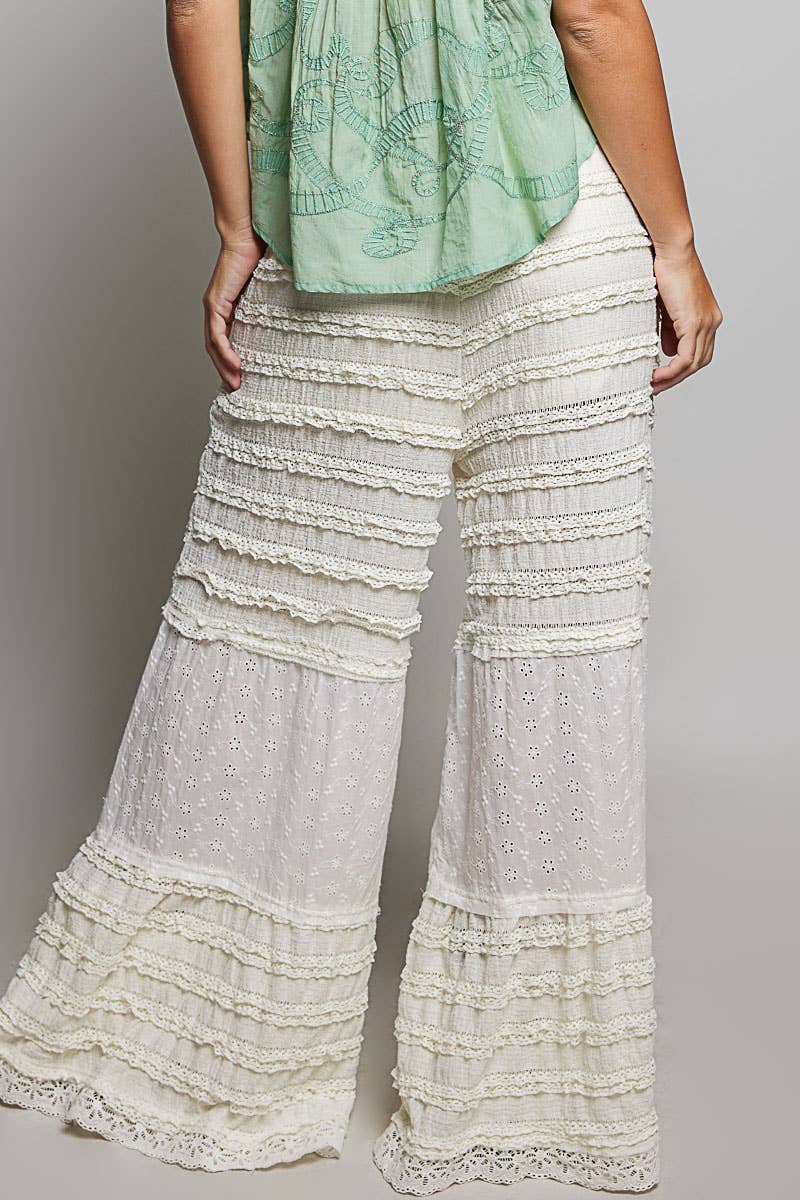 Wide high-rise lace pants featuring cotton eyelet patches, floral cotton trim at the leg openings, and an elastic waistband with loop detail. Finished in a solid color, these pants offer a feminine, airy silhouette with comfortable, effortless styling. Specs/Dimensions: - WAIST: 14" - RISE: 13" - INSEAM: 27-1/2"