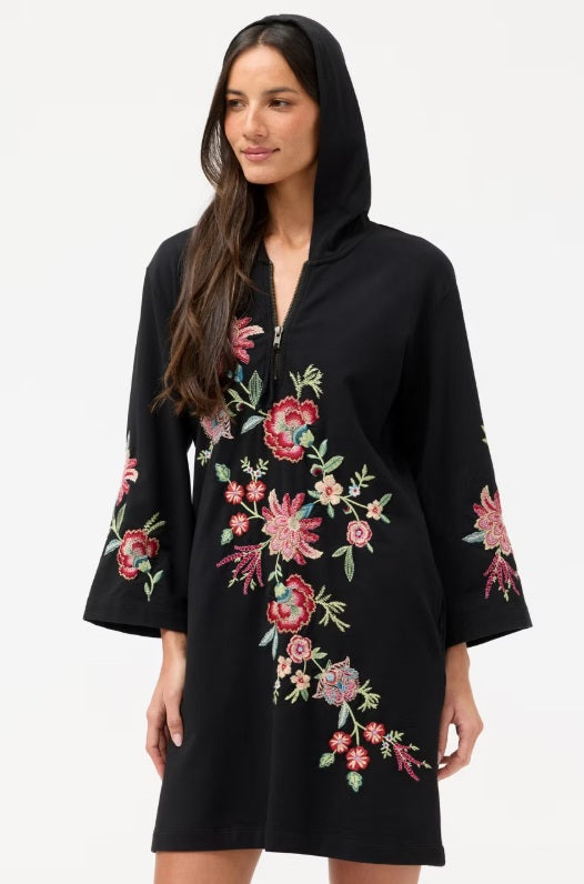 The Zip Up Hooded Knit Beach Dress is crafted from a rich cotton blend with a hint of stretch. Featuring an attached hood and a quarter-zip closure, this easy dress is embellished with vibrant floral embroidered detailing. Layer over Johnny Was swimwear and pair with comfortable pool slides for a day lounging poolside.