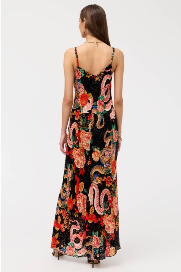 Crafted from a unique silk blend, the Kanako Dress is embellished with a vibrant design blending rich florals and scrolling decorative accents. Featuring a V-neckline at the front and back, this sleeveless tank is finished with a full lining. Pair with bold gold jewelry and colorful bangles for a polished evening look.