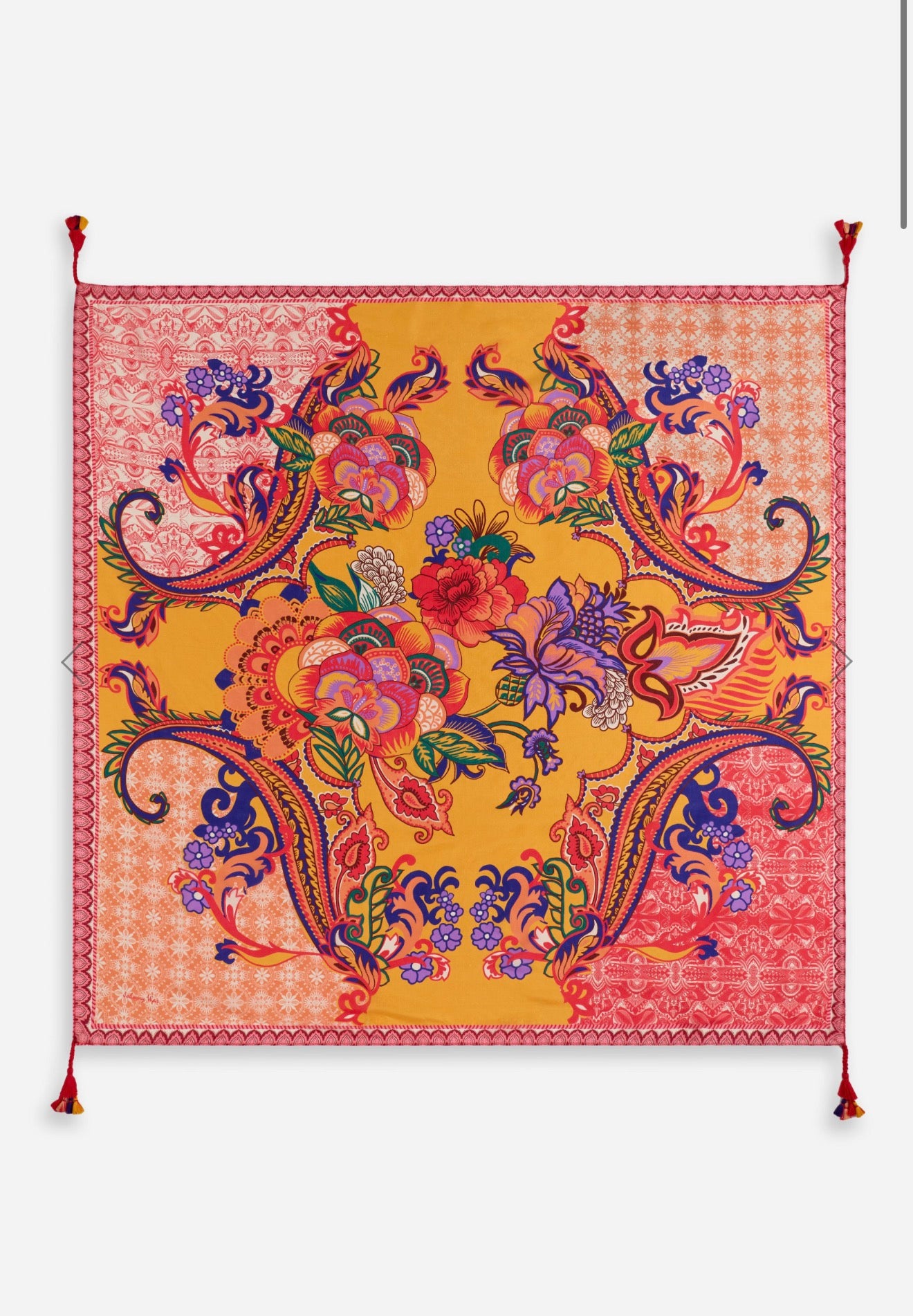 Crafted from luxurious 100% silk, the Linnea Silk Scarf is adorned with a rich scarf pattern accented with vibrant red color. Thoughtfully designed to enhance any look, this square scarf is finished with tassels at each corner for added texture. Tie at the neck or at the handle of your favorite back for a pop of color.