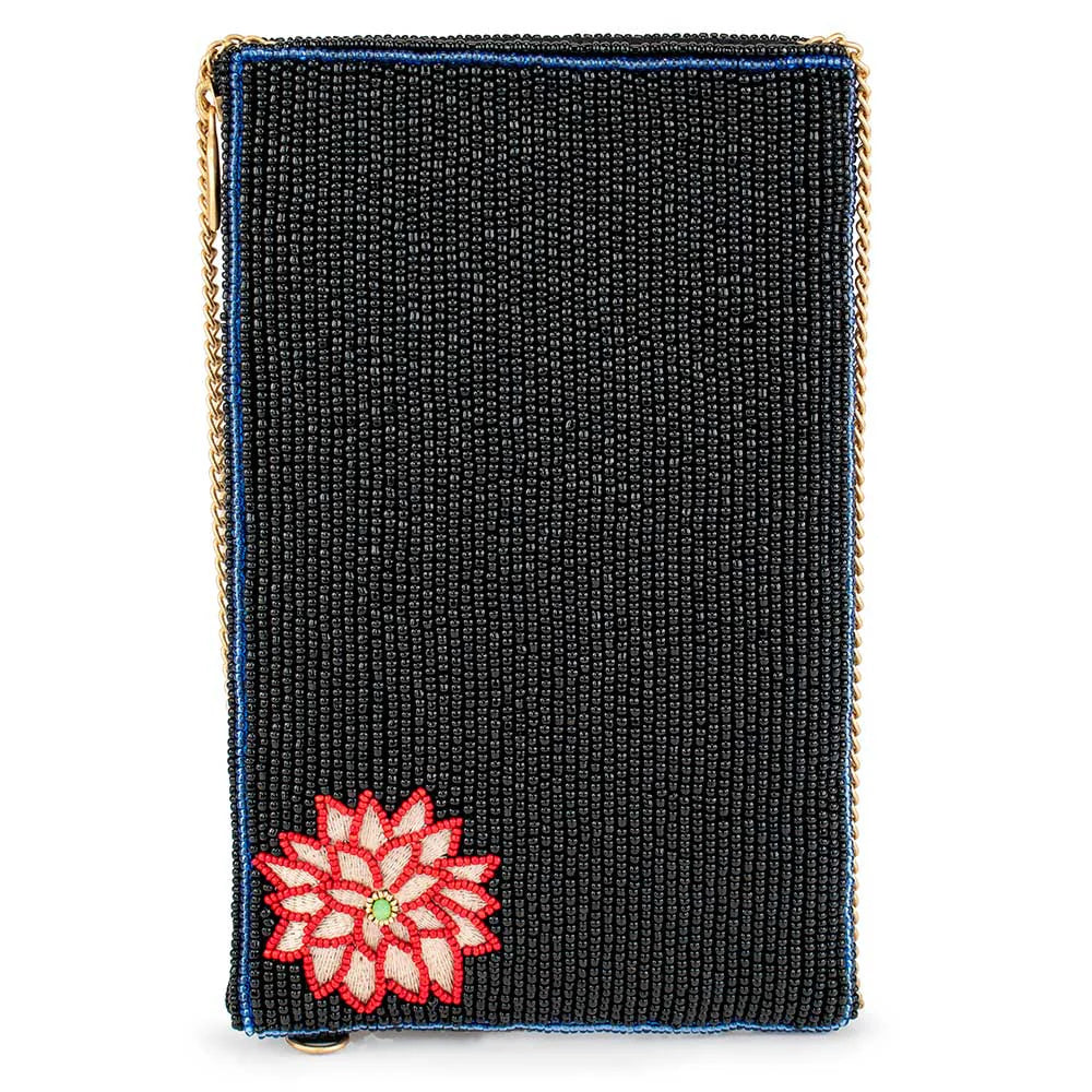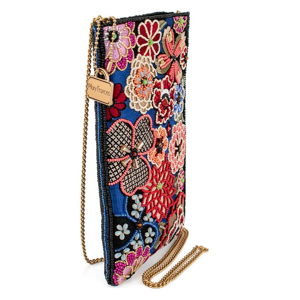 A modern beaded & embroidered floral pattern dances across a field of rich blue embroidery on this fashion-forward crossbody phone bag.