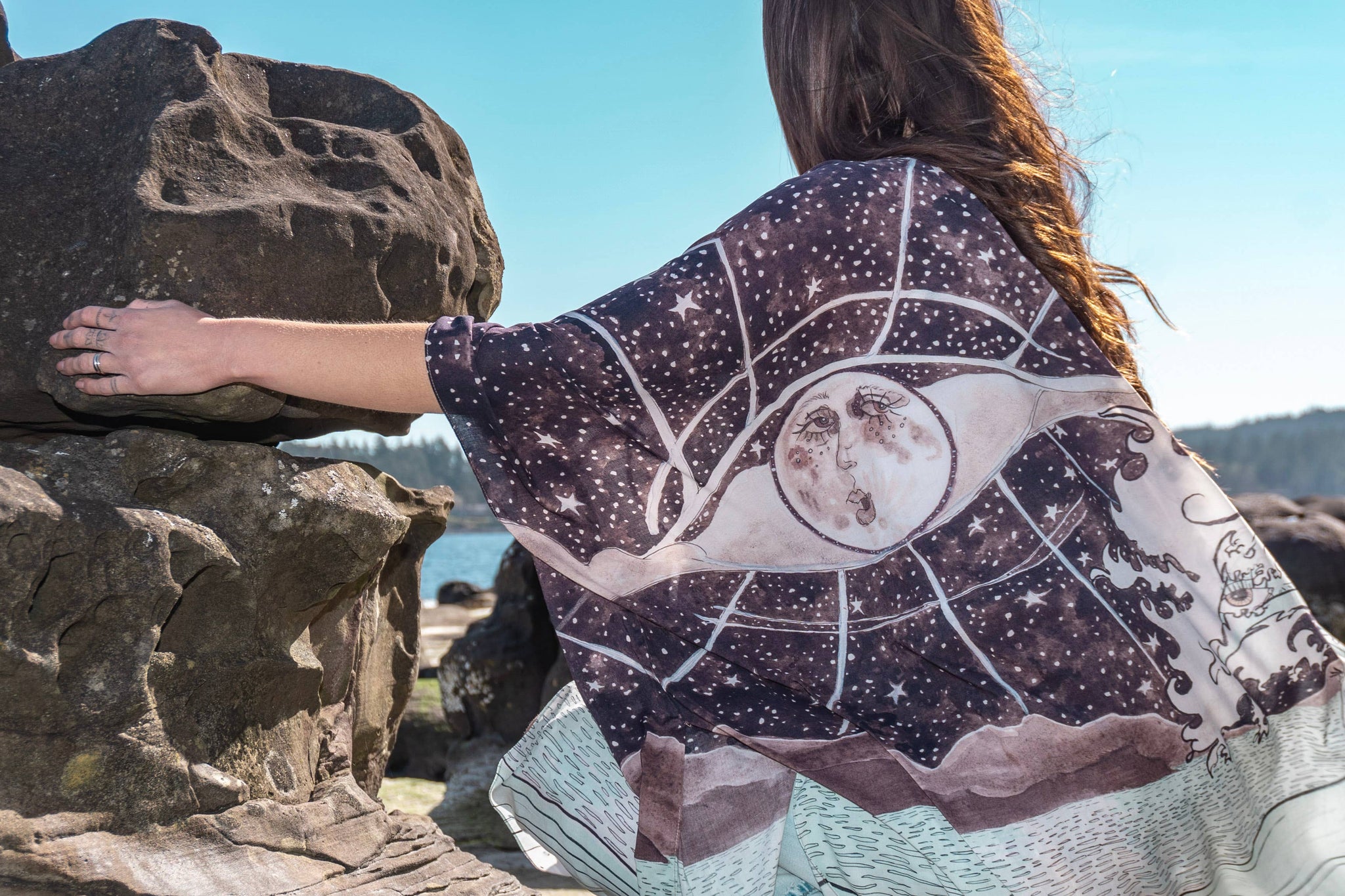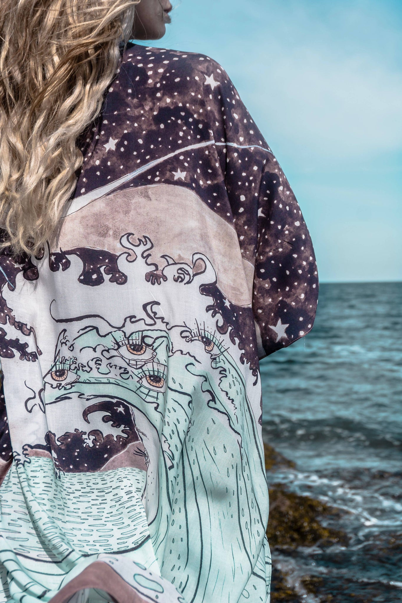 Why shouldn’t what we wear be a reflection of what’s inside our hearts? Created to celebrate a deep connection to the sky and the sea, this piece is truly a wearable work of art, with so many layers of meaning to get lost in. The artwork on this incredible kimono was painted by artist Leslie Love, who made her own paints for the project using acorn cap ink, walnut husk, rosehips, and copper oxide from from copper welding in her Dad’s workshop. Of the piece, she says “When I need to restart, to refresh, to wash away my anxiety… I go to the ocean… I look at the moon and stars. I look up and sigh, everything is going to be fine. I look at the ocean, hypnotized by the waves, soothed, forgiven.” 100% viscose (derived from plant fibres such as wood and bamboo). Machine wash gentle or handwash and hang to dry. Kimono measurements: length 92cm , width 110cm. Models are 5’8” and 5’6” for reference. * boho gypsy chic lounge bohemian artisan beach