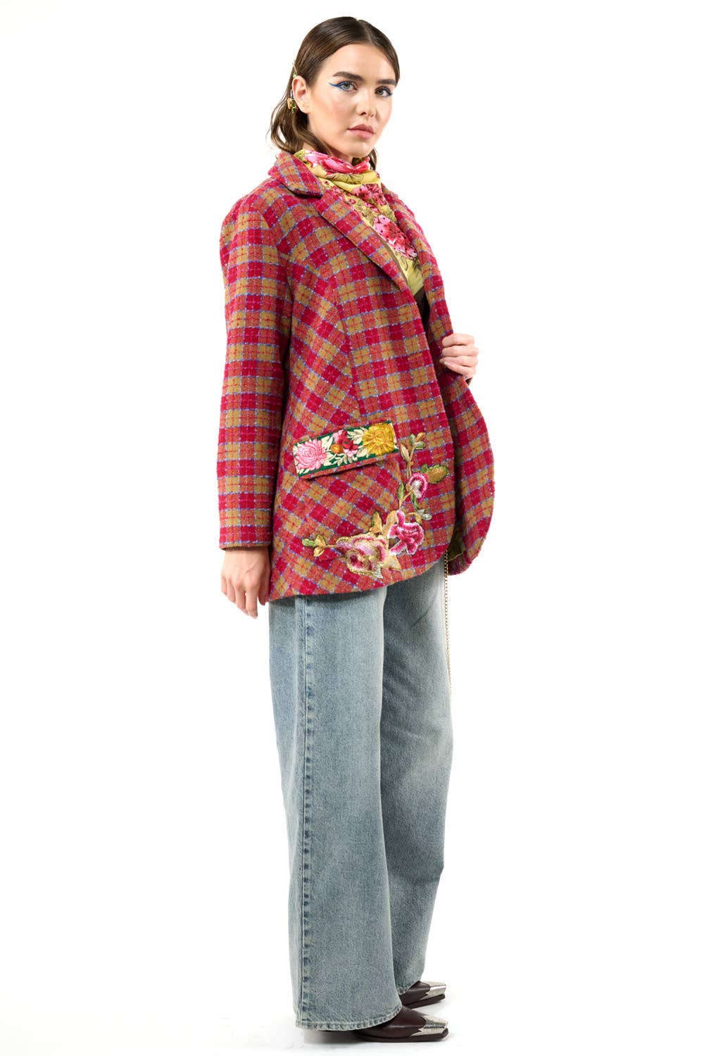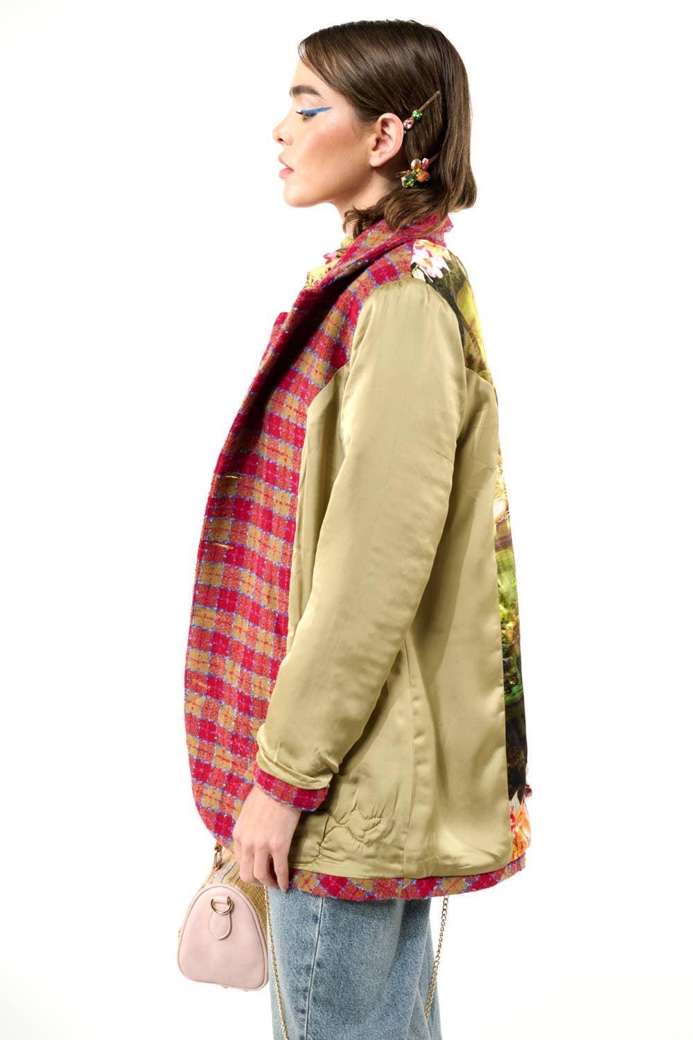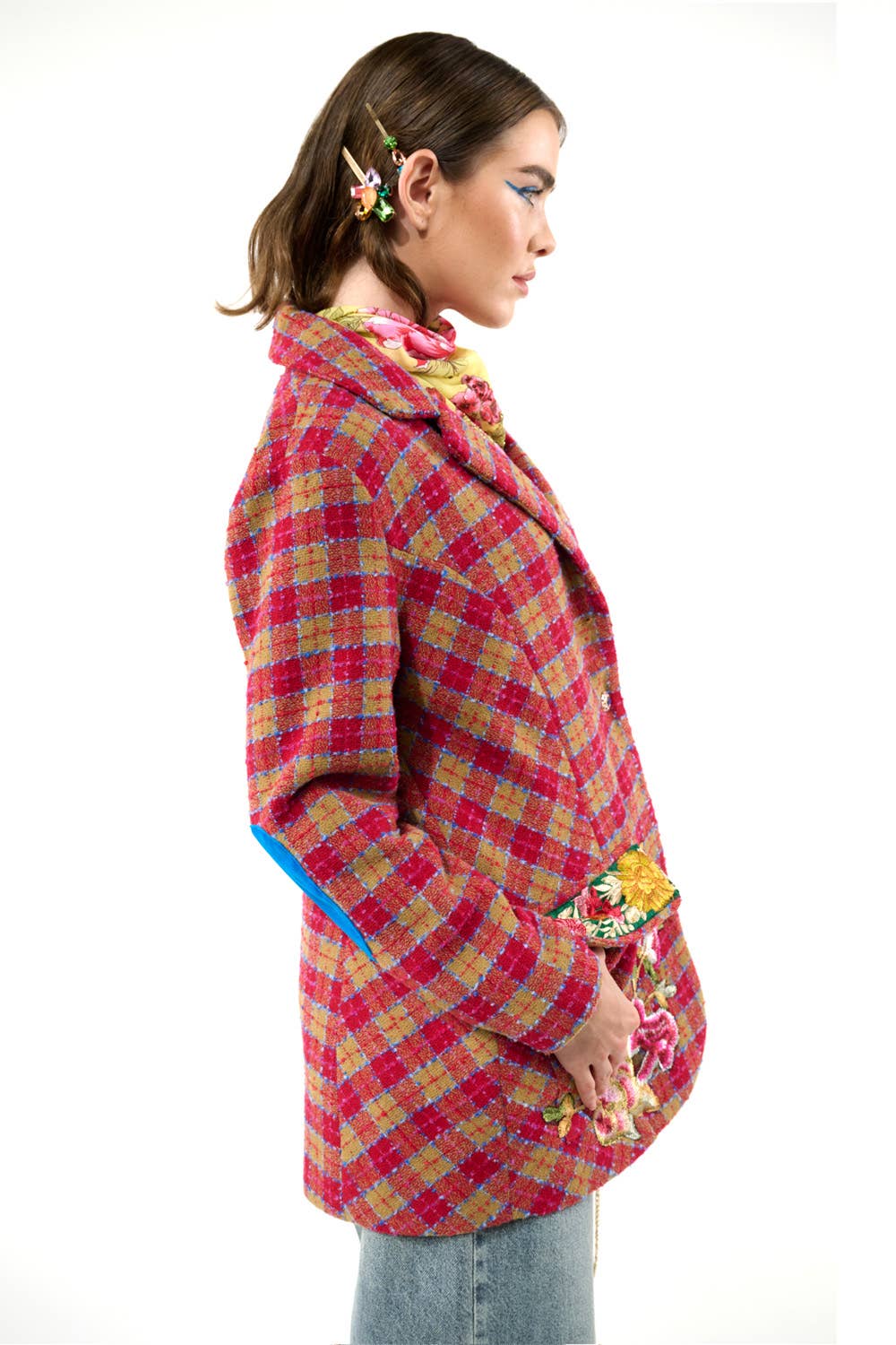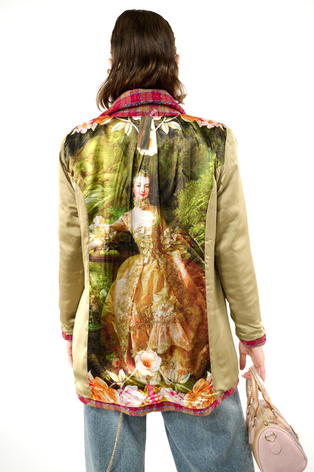 Boucle button-up embellished blazer, front closure with crystal buttons, 1 upper front patch pocket, 2 lower front flap pockets (flaps with embroidered trims), right front hem with embroidered patch, 2 contrast elbow patches, center back lining with Francois Boucher Madame De Pompadour print, blazer fully lined with satin fabric