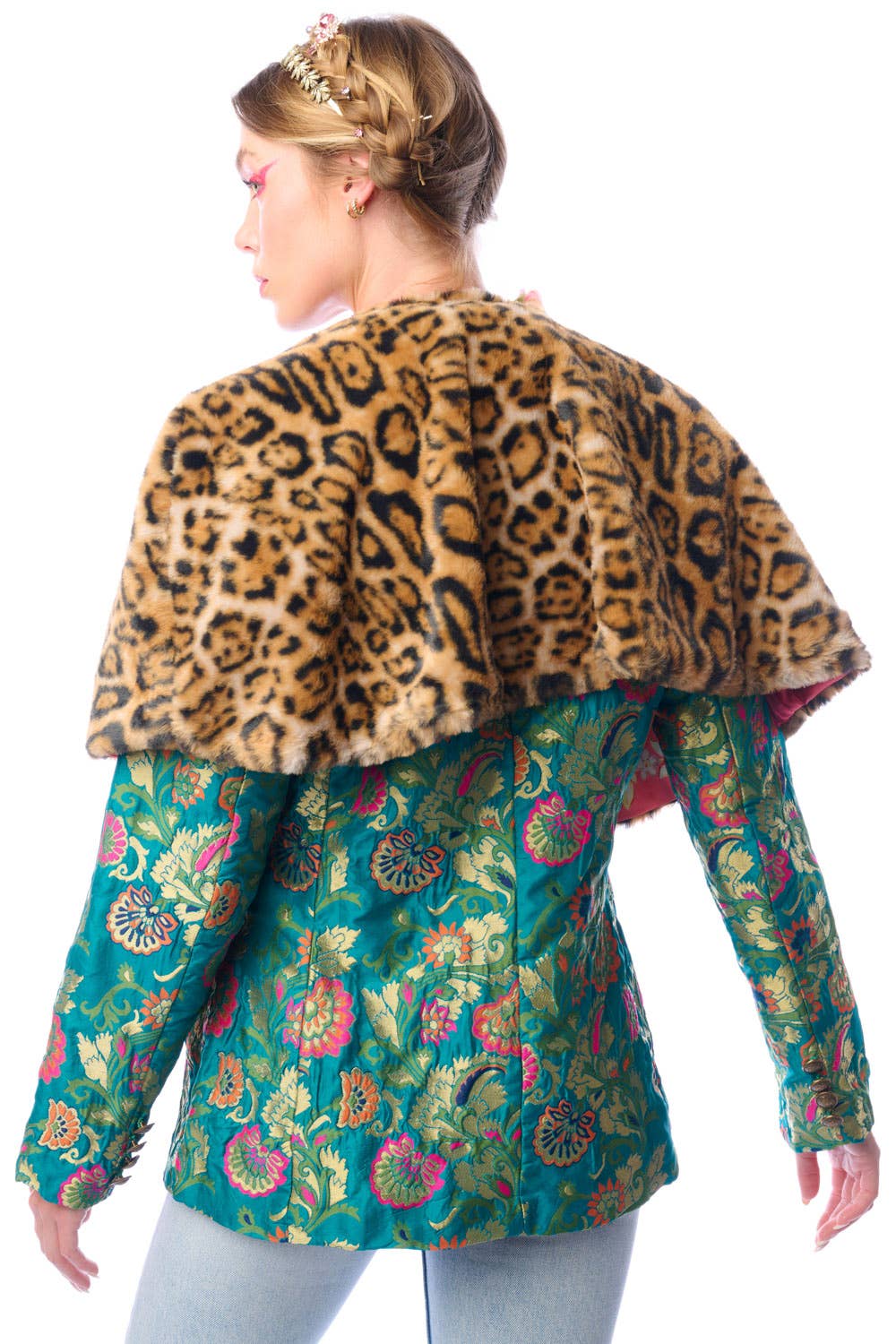 * Floral jacquard silk blend blazer with Francois Boucher Madame De Pompadour print satin lining, metallic gold trim on edge of the collar/lapel & flap pockets, 1 decorative button * Teal