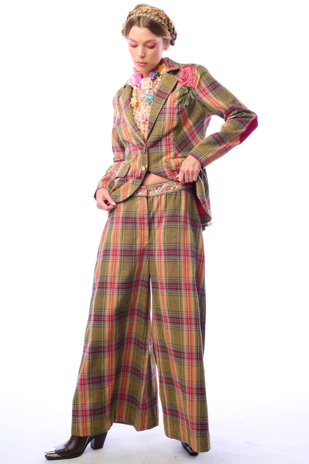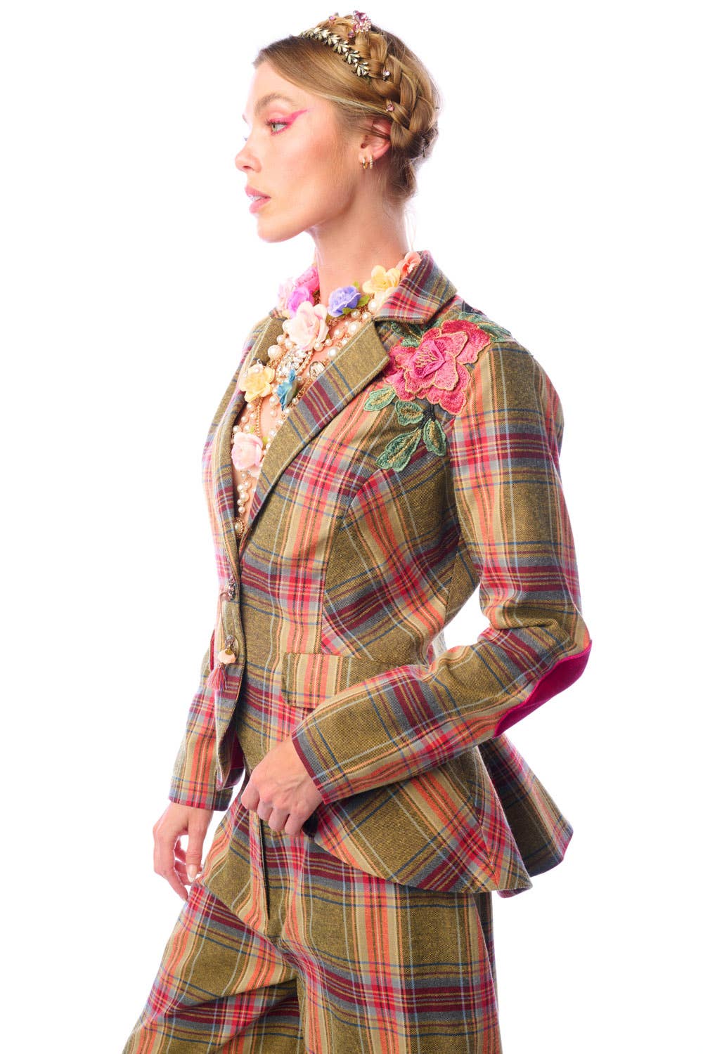 * Plaids button-up blazer with embroidered floral patch on front & back shoulder, contrast velvet elbow patches, 1 crystal button & 1 floral tasseled pin attached to the center front, 2 front flap pockets, satin lining