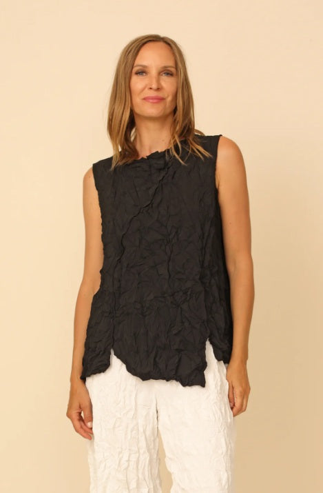 A simple basic with elevated details. The sleeveless Levana Tank gorgeously suits any silhouette with it’s flattering A-line fit, alongside its unique asymmetrically slitted hem. Comfortably suitable for all day wear with a rounded neckline in lightweight crinkle embossed woven fabric. Perfected to travel anywhere and everywhere you go this season.