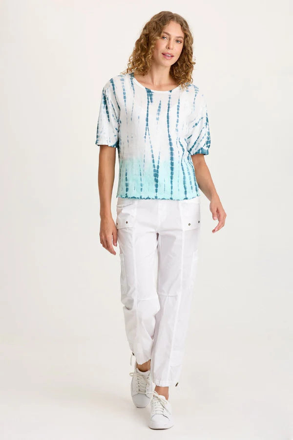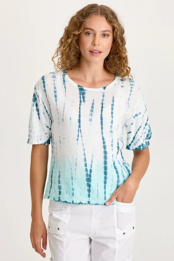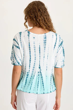 - Color Description: Teal Dashed Tie Dye with Aqua Dip Dye on White Ground