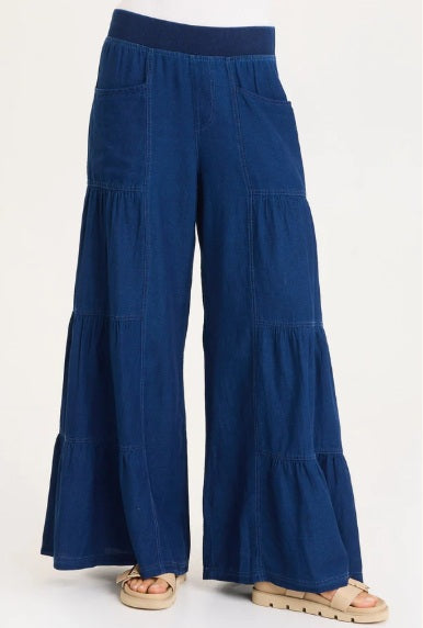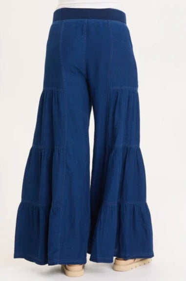 Tiers and denim is all anyone needs! This wide leg has both! With front pocket, clean back and a pull-on elastic waistband.