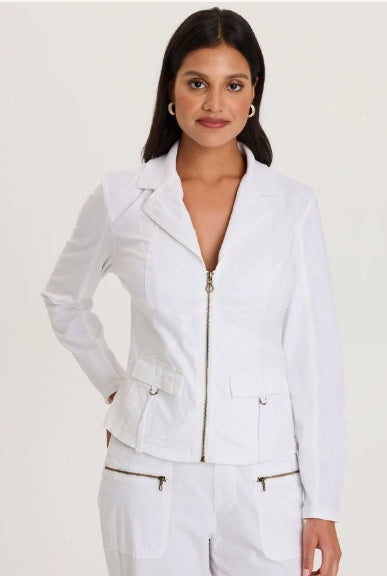Intricate seaming details are paired with brass hardware, front pockets and rib inserts in this stunning structured jacket.