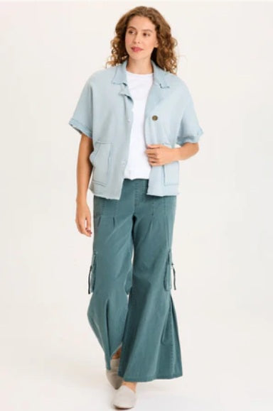 Cozy up with this little capelet! Featuring a double breasted look with front pockets and reverse fleece details.